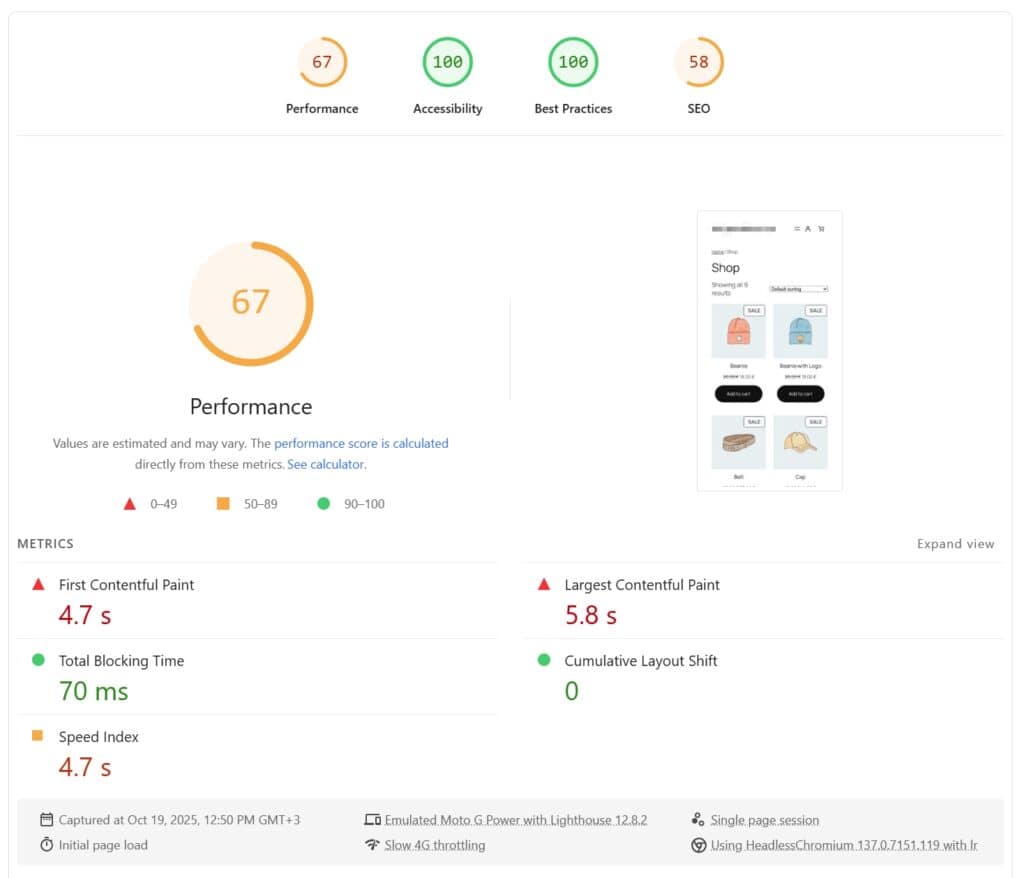 We also measured two pages (the shop/archive page and a product page) using PageSpeed Insights to see what a real user would theoretically experience. Remember: WooCommerce’s results include the WooCommerce Stripe Gateway plugin, which adds extra resources and extra work for the browser.