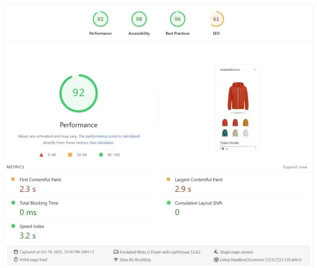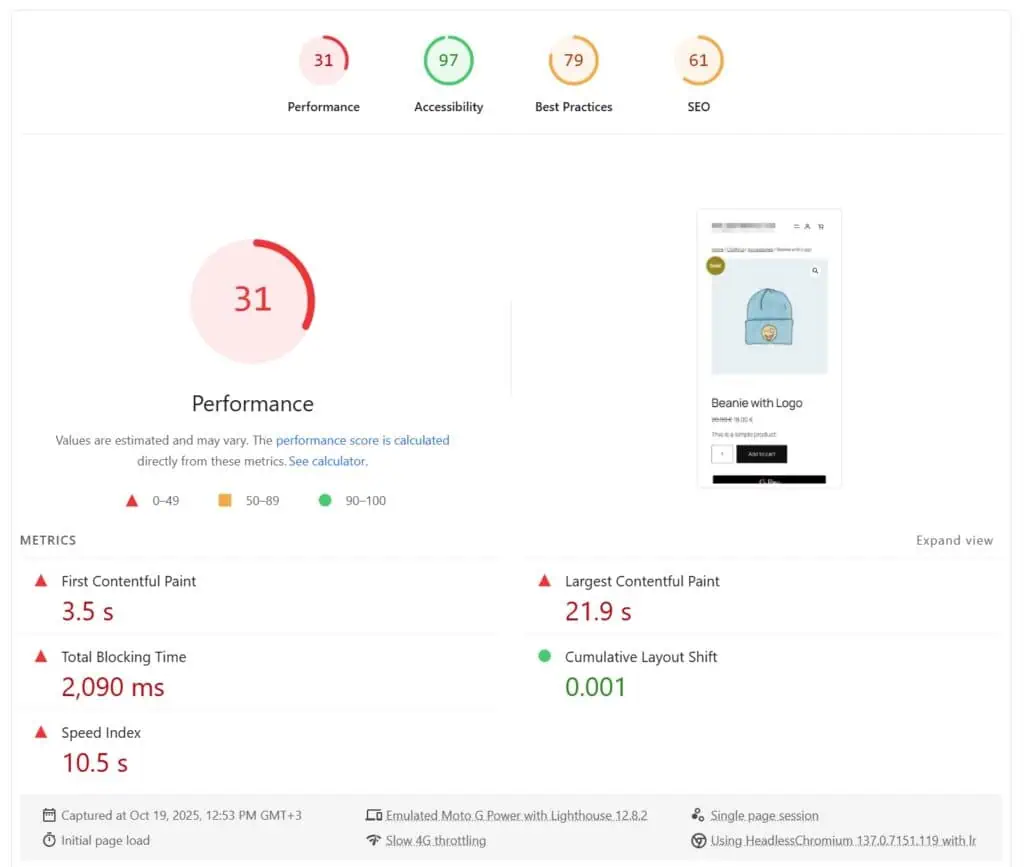 We also measured two pages (the shop/archive page and a product page) using PageSpeed Insights to see what a real user would theoretically experience. Remember: WooCommerce’s results include the WooCommerce Stripe Gateway plugin, which adds extra resources and extra work for the browser.