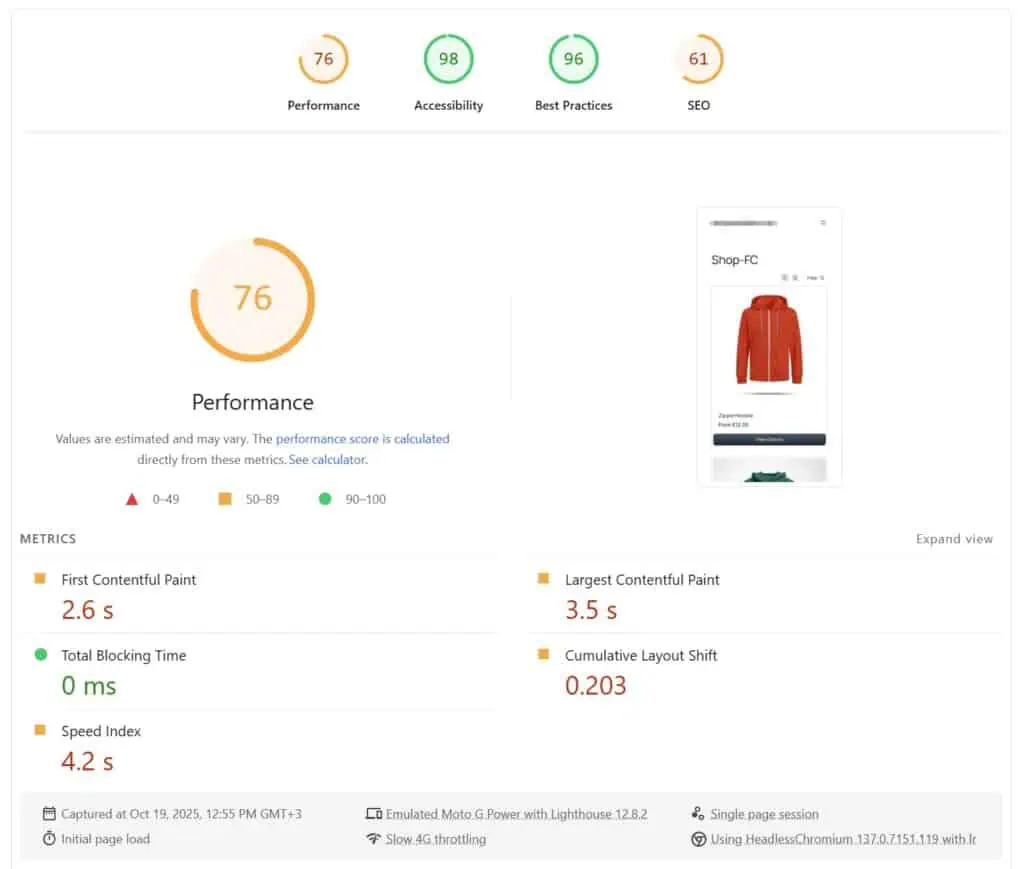 Honestly, WooCommerce’s results are disappointing considering how popular it is (powering over 8% of all websites in the whole world). The only Core Web Vital it keeps under control is the CLS, which FluentCart still needs to improve.