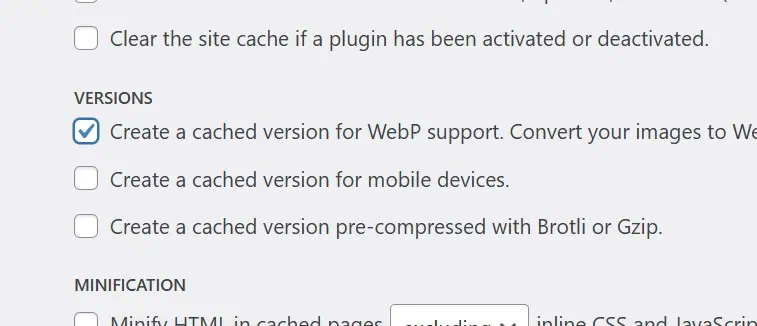 - Cache Enabler: Simply enable the “Create a cached version for WebP support” option.