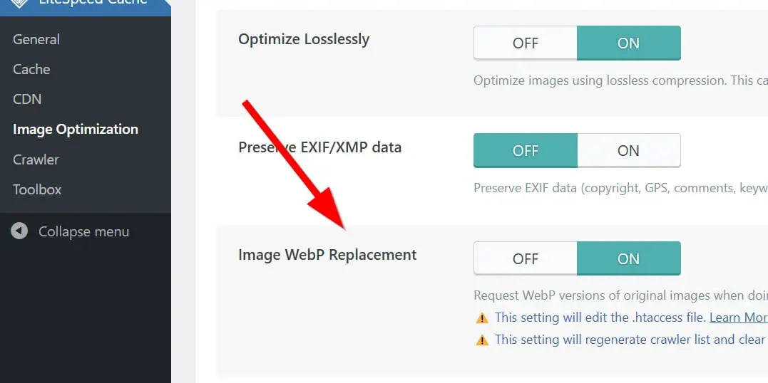 - LiteSpeed Cache: You’ll need to enable the “Image WebP Replacement” setting under LiteSpeed Cache > Image Optimization > Image Optimization Settings.