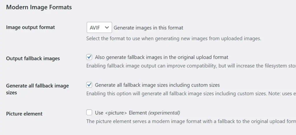 - Picture element — Unchecked for better performance. This option is the same as ShortPixel’s, and while it offers good compatibility, it changes the HTML structure, which can be problematic in some cases.