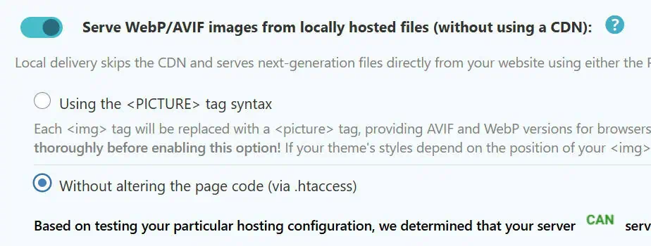 - Activate the option: “Serve WebP/AVIF images from locally hosted files (without using a CDN).”