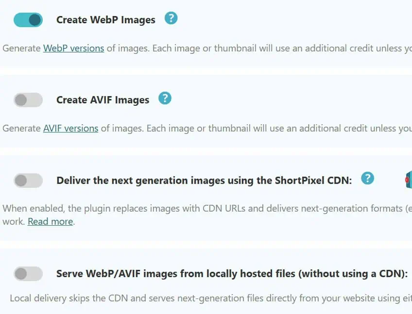 If you prefer not to use ShortPixel’s delivery options, you can still use the plugin to generate WebP files and let another plugin handle delivery. The most popular compatible options are: