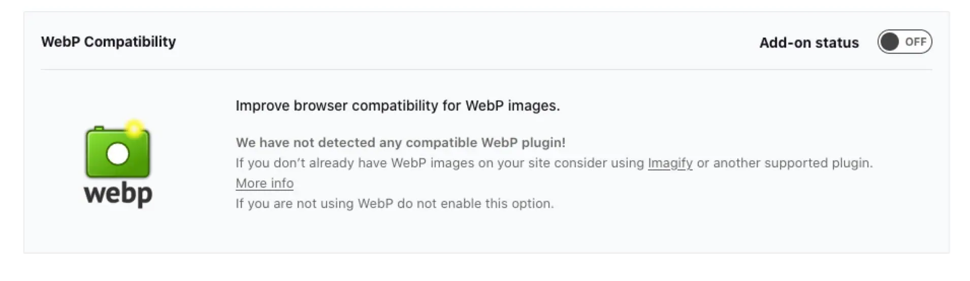 - WP Rocket: You will have to enable the WebP Compatibility add-on.